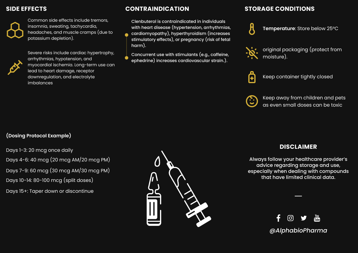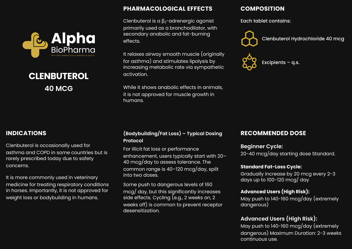 Elke tablet bevat 40 mcg Clenbuterol, een sympathomimetisch amine dat werkt als een bronchodilatator en thermogeen middel. De tabletten zijn ontworpen voor gemakkelijke dosering en opname.