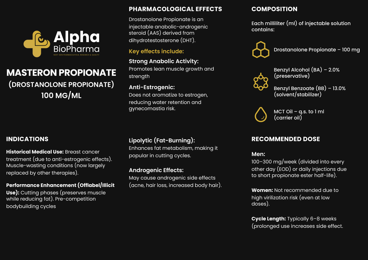 Welkom bij onze uitgebreide productomschrijving van Masteron Propionate 100 mg van Dutch Pharma. Masteron, ook bekend als Drostanolone, is een populaire anabole steroïde die gewaardeerd wordt om zijn vermogen om droge spiermassa op te bouwen en de lichaamsdefinitie te verbeteren. In deze gedetailleerde beschrijving zullen we de historie van het product, de juiste gebruiksrichtlijnen, de voordelen, combinatiemogelijkheden met andere steroïden, kuurschema's, Masteron Propionate 100 mg kopen, mogelijke bijwerkingen, fictieve klantervaringen en een conclusie behandelen.