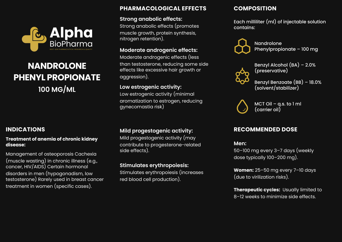 Nandrolone Phenyl Propionate (NPP) is een anabole steroïde die structureel vergelijkbaar is met Nandrolone Decanoate, maar met een kortere ester. Dit betekent dat het sneller in het lichaam wordt opgenomen en een kortere halfwaardetijd heeft, waardoor het sneller resultaten oplevert. NPP wordt vaak geprezen om zijn vermogen om spiermassa te vergroten, kracht te verbeteren en herstel te versnellen.